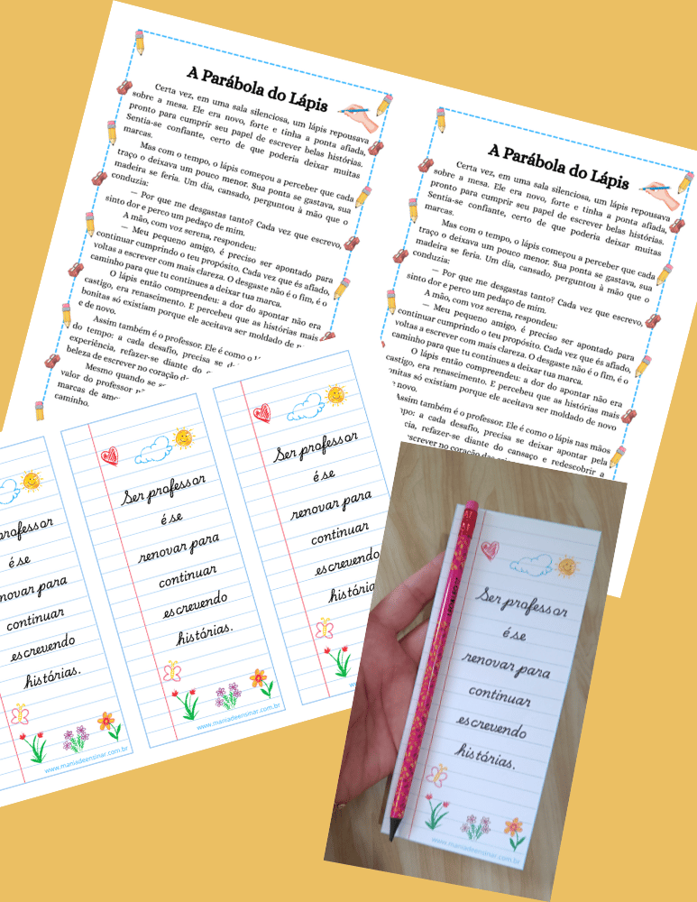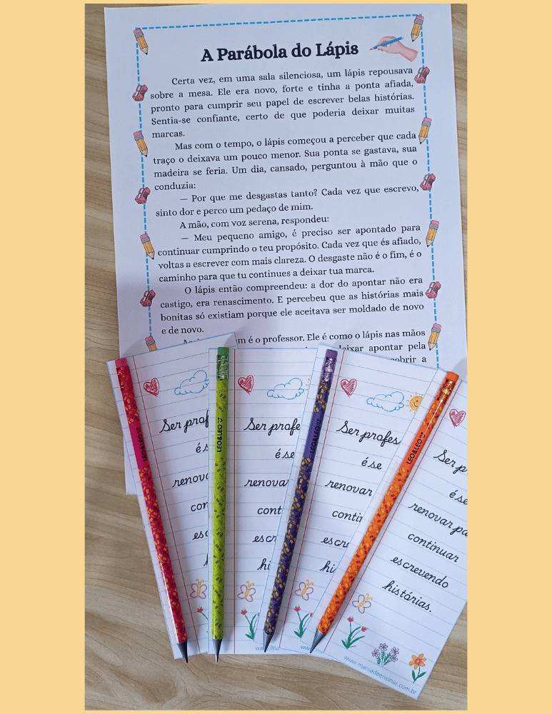 A Parábola do Lápis traz uma metáfora simples e poderosa: assim como o lápis, o professor se desgasta, é desafiado, precisa ser “apontado” pelas experiências… mas é exatamente isso que o permite continuar escrevendo histórias no coração das crianças.